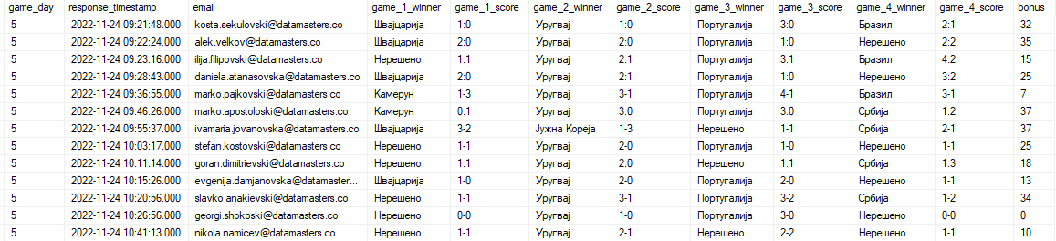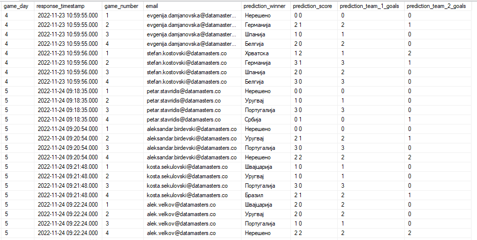 - Сите што доцнеа (иако постоеше револт) не ги вклучувавме во дневна калкулација на поени. За секој натпревар го имаме датумот и времето на почеток и според датумот и времето на предикциите, го елиминираме секој невалиден (задоцнет) влез на податоци.