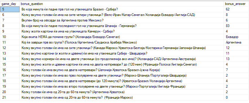 - Секој од овие редови се поврзува со табелата со точни резултати и така пресметуваме колку поени освоил секој учесник.