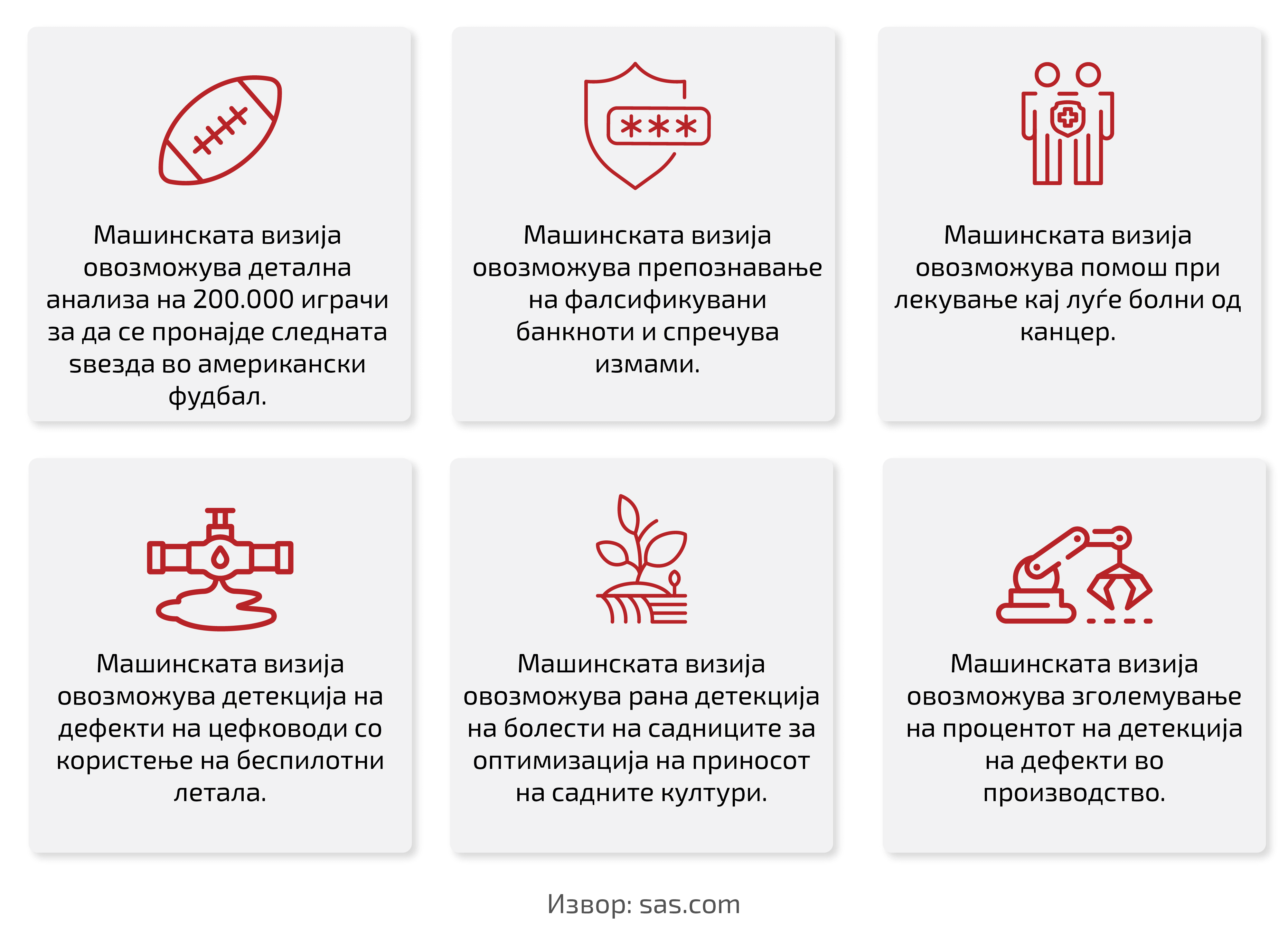 - Машинската визија овозможува препознавање на лица за безбедносни апликации